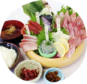 魚市場ならではの新鮮なお刺身をふんだんに盛り込んだ当店自慢の定食。水揚げ状況により、毎日内容は変わります。その日の一番美味しいお魚をご堪能ください。