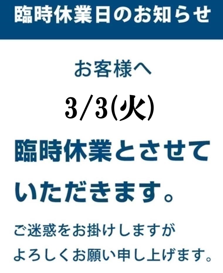 3/3(火)臨時休業とさせて頂きます。