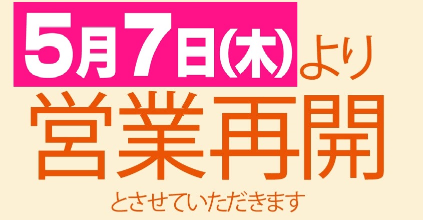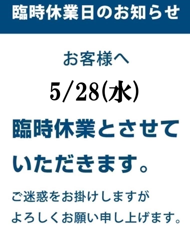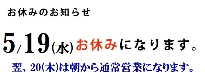 5/21(水)臨時休業で、翌、22(木)は朝から通常通り営業です。