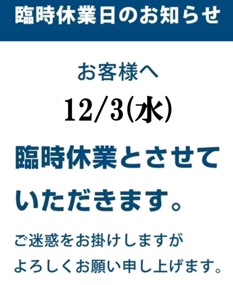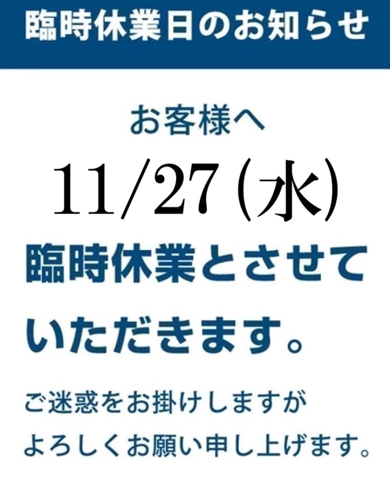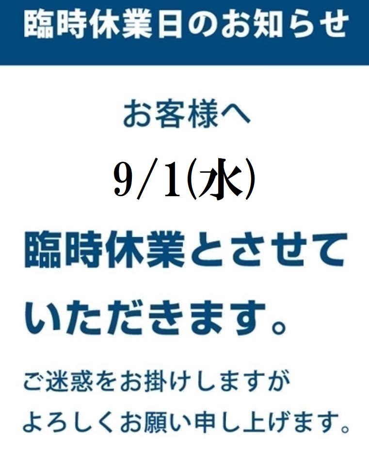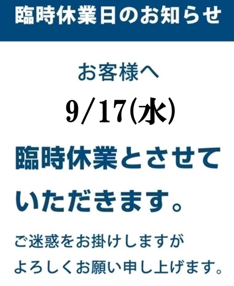 大変申し訳ございませんが、9/27(水)は臨時休業とさせていただきます。
