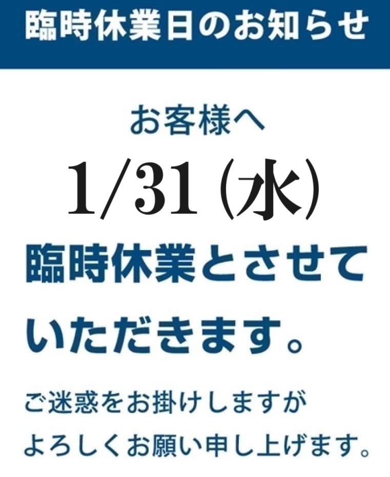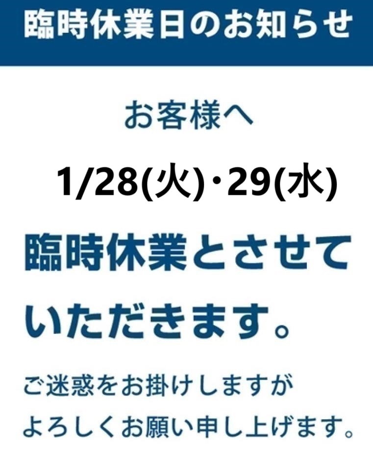 1/27(火)・28(水)臨時休業とさせて頂きます。
