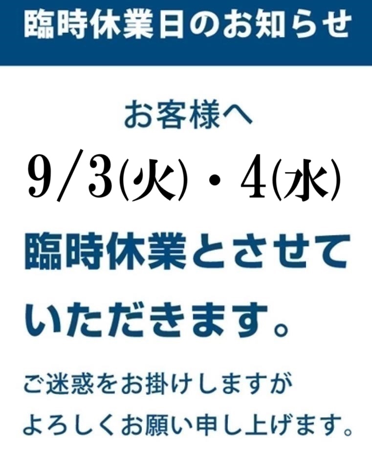 9/9(火)・10(水)は連休をとらせて頂きます。