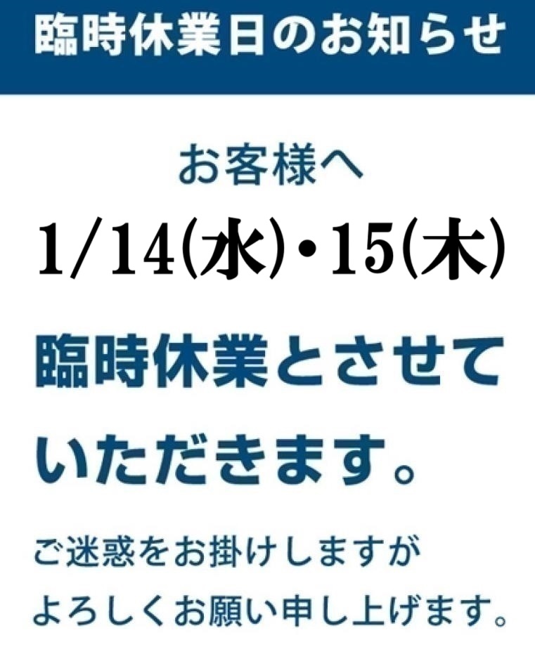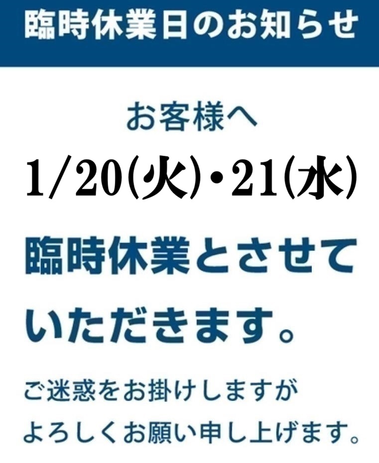 1/20(火)・21(水)は臨時休業とさせて頂きます。