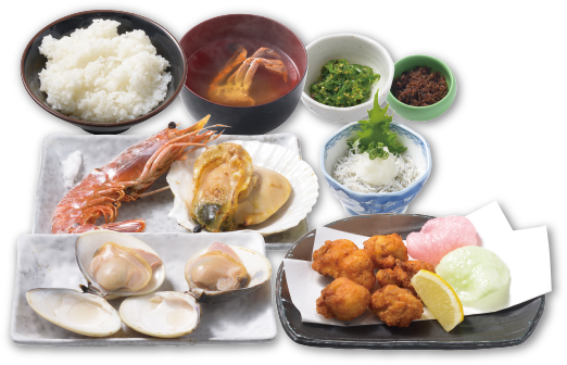 はまぐり(又はホンビノス貝)・えび・ほたて・季節の唐揚げ・しらすおろし・ライスセット