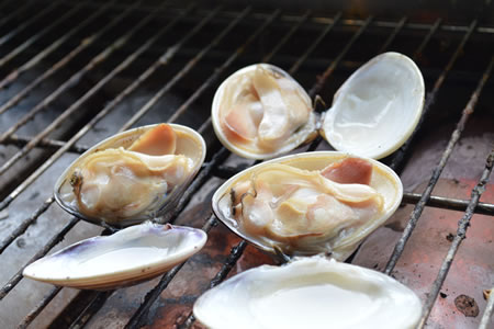 「浜焼き」の文字が目印。目の前で焼いて焼き立てをお出しします。